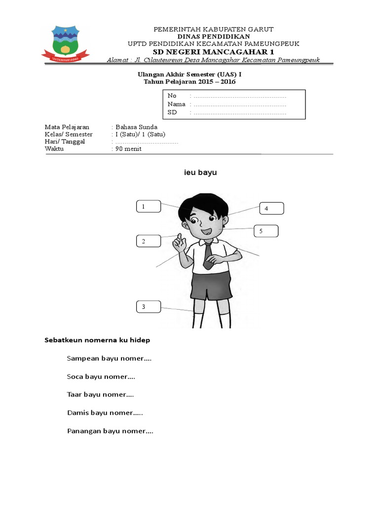 Kumpulan soal bahasa sunda untuk uas sekolah. Soal bahasa sunda kelas 6 kurikulum 2013 berikut ini adalah soal bahasa sunda kelas 6 kurikulum 2013 yang bisa anda download secara gratis di website kami. Soal - soal persiapan UAS ini merupakan sarana yang dapat digunakan sebagai latihan menjelang pelaksanaan UAS di Sekolah. Soal UAS Kelas 6 SDMI Pada.