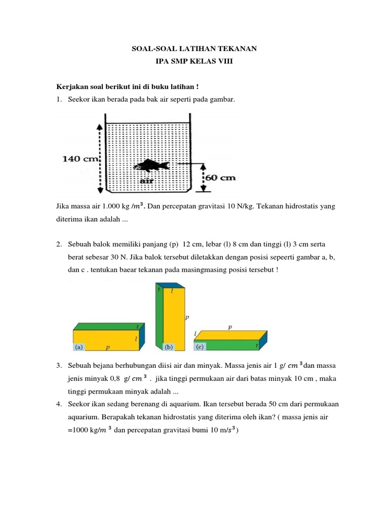 Jika tinggi balok yang terapung adalah 4 cm maka hitunglah tinggi total balok tersebut. Admin dari blog contoh soal terbaru 2020 juga mengumpulkan gambar gambar lainnya terkait contoh soal tekanan zat padat kelas 8 dibawah ini. Soal tekanan kelas 8 Tekanan merupakan permukaan atau bidang yang di kenai oleh gaya sedang gaya yang di peroleh dalam tekanan di sebut gaya tekan.