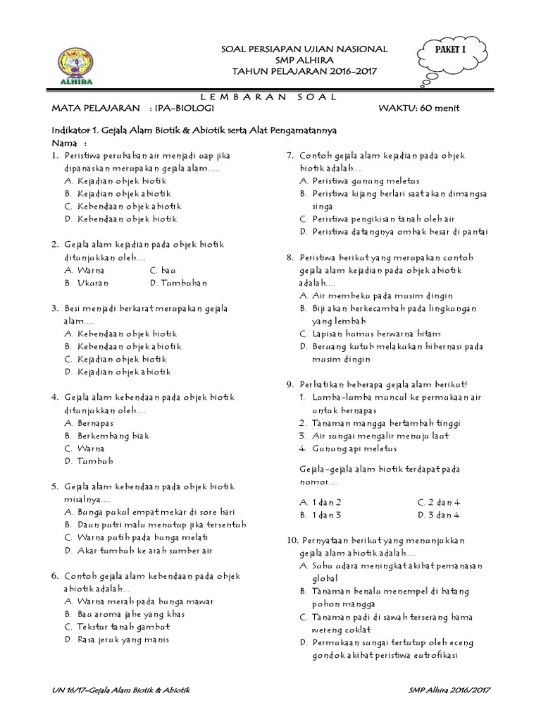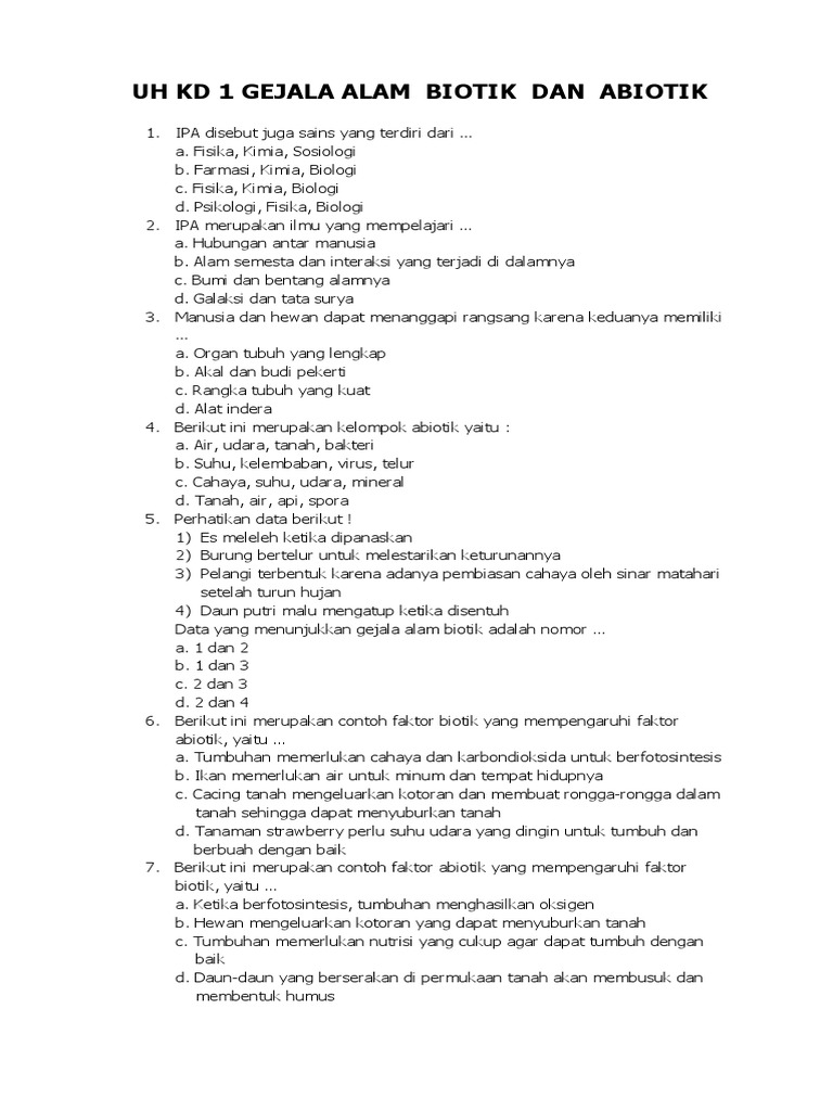 Latihan Soal Biologi Kelas Vii Semester I 1. Contoh Soal Gejala Alam Biotik dan Abiotik SMP 1 Berdasarkan kisi kisi un terbaru materi gejala alam biotik dan abiotik termuat dalam satu level kognitif yaitu level kognitif pengetahuan dan pemahaman. Biologi merupakan salah satu cabang ilmu pengetahuan alam.